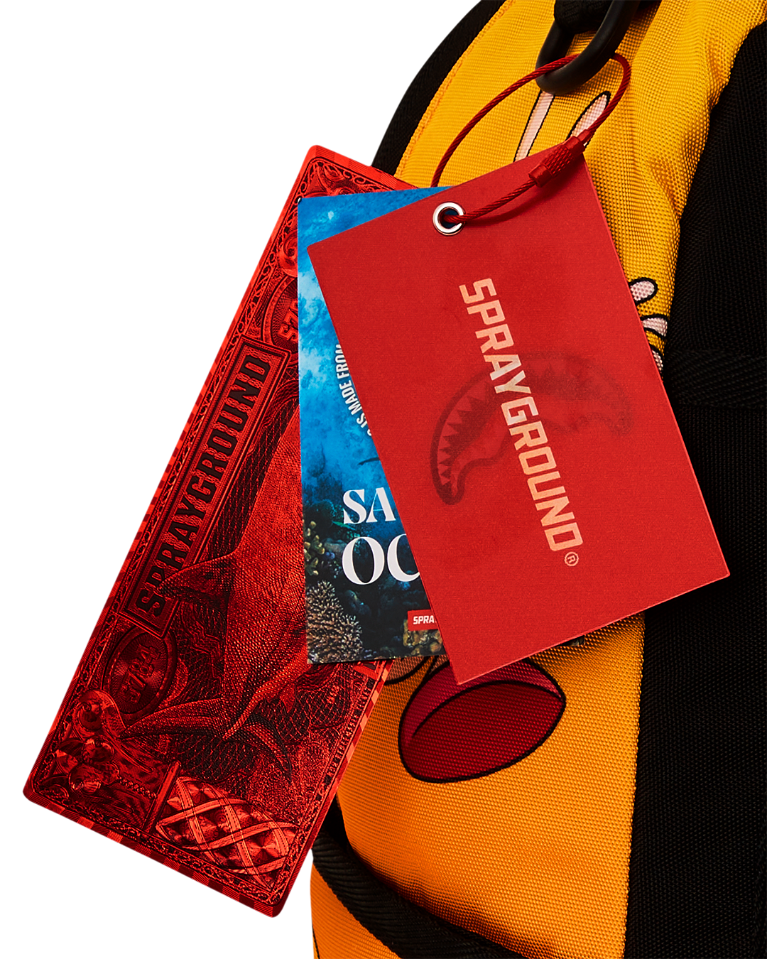 Dimensions: 18" x 6" x 11.5" • Front zipper pocket • Side pockets • Zippered Stash pocket • Separate velour sunglass compartment • Ergonomic mesh back padding • Adjustable Straps for custom sizing • Gold zippers with metal hardware • Metal "Sprayground Authentic" badge • Slide through back sleeve connects to carry-on luggage to free your hands