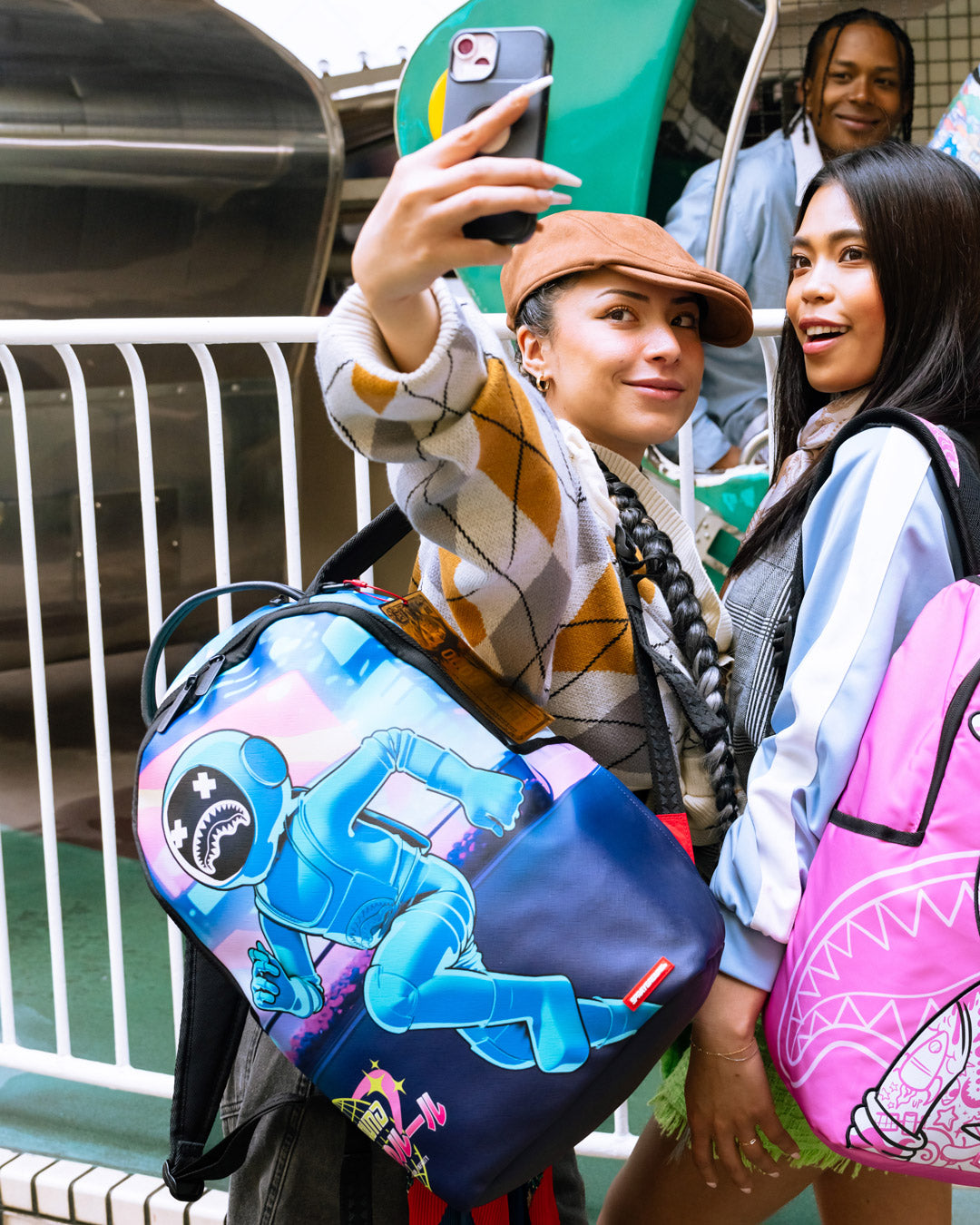 Dimensions: 18" x 6" x 11.5" • Front zipper pocket • Side pockets • Zippered Stash pocket • Separate velour sunglass compartment • Ergonomic mesh back padding • Adjustable Straps for custom sizing • Gold zippers with metal hardware • Metal "Sprayground Authentic" badge • Slide through back sleeve connects to carry-on luggage to free your hands