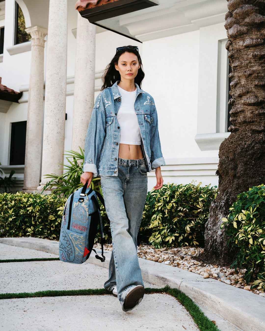 Dimensions: 18" x 6" x 11.5" • Front zipper pocket • Side pockets • Zippered Stash pocket • Separate velour sunglass compartment • Ergonomic mesh back padding • Adjustable Straps for custom sizing • Gold zippers with metal hardware • Metal "Sprayground Authentic" badge • Slide through back sleeve connects to carry-on luggage to free your hands