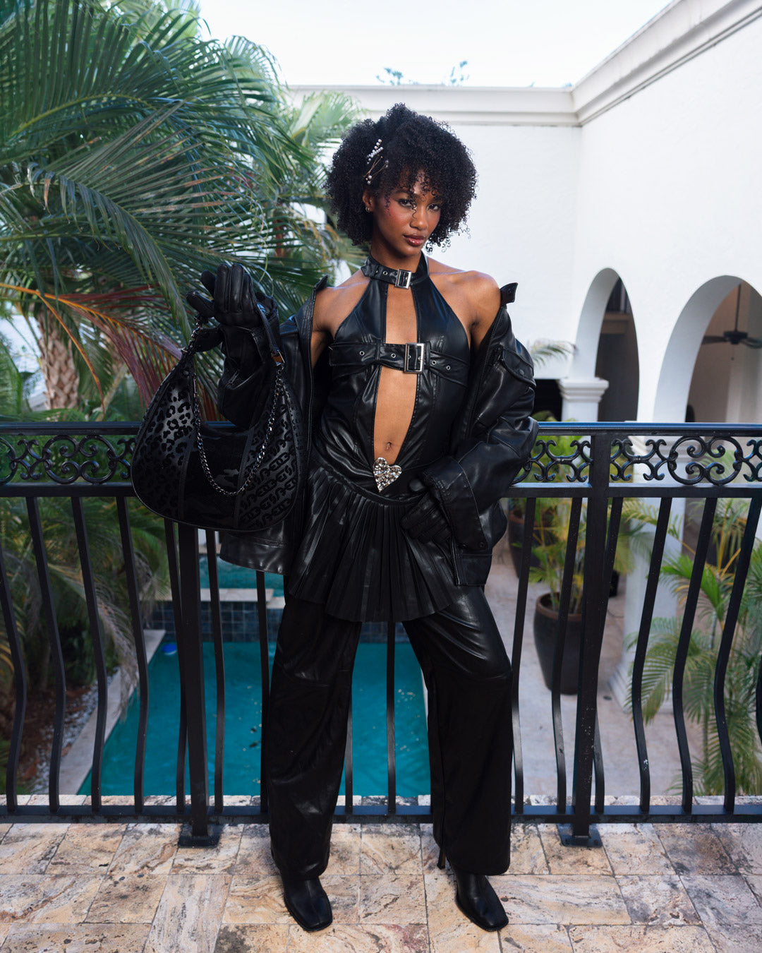 PVC shoulder bag with flocking technique, PVC applique, and cut and sew sharkmouth.