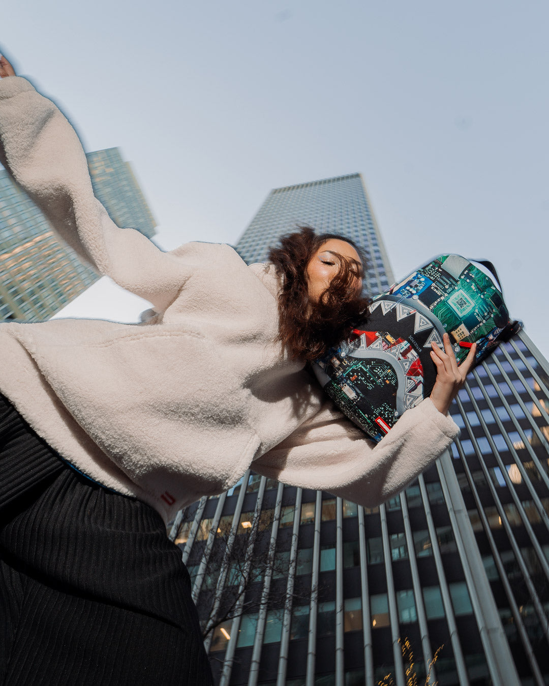 Dimensions: 18" x 6" x 11.5" • Front zipper pocket • Side pockets • Zippered Stash pocket • Separate velour sunglass compartment • Ergonomic mesh back padding • Adjustable Straps for custom sizing • Gold zippers with metal hardware • Metal "Sprayground Authentic" badge • Slide through back sleeve connects to carry-on luggage to free your hands