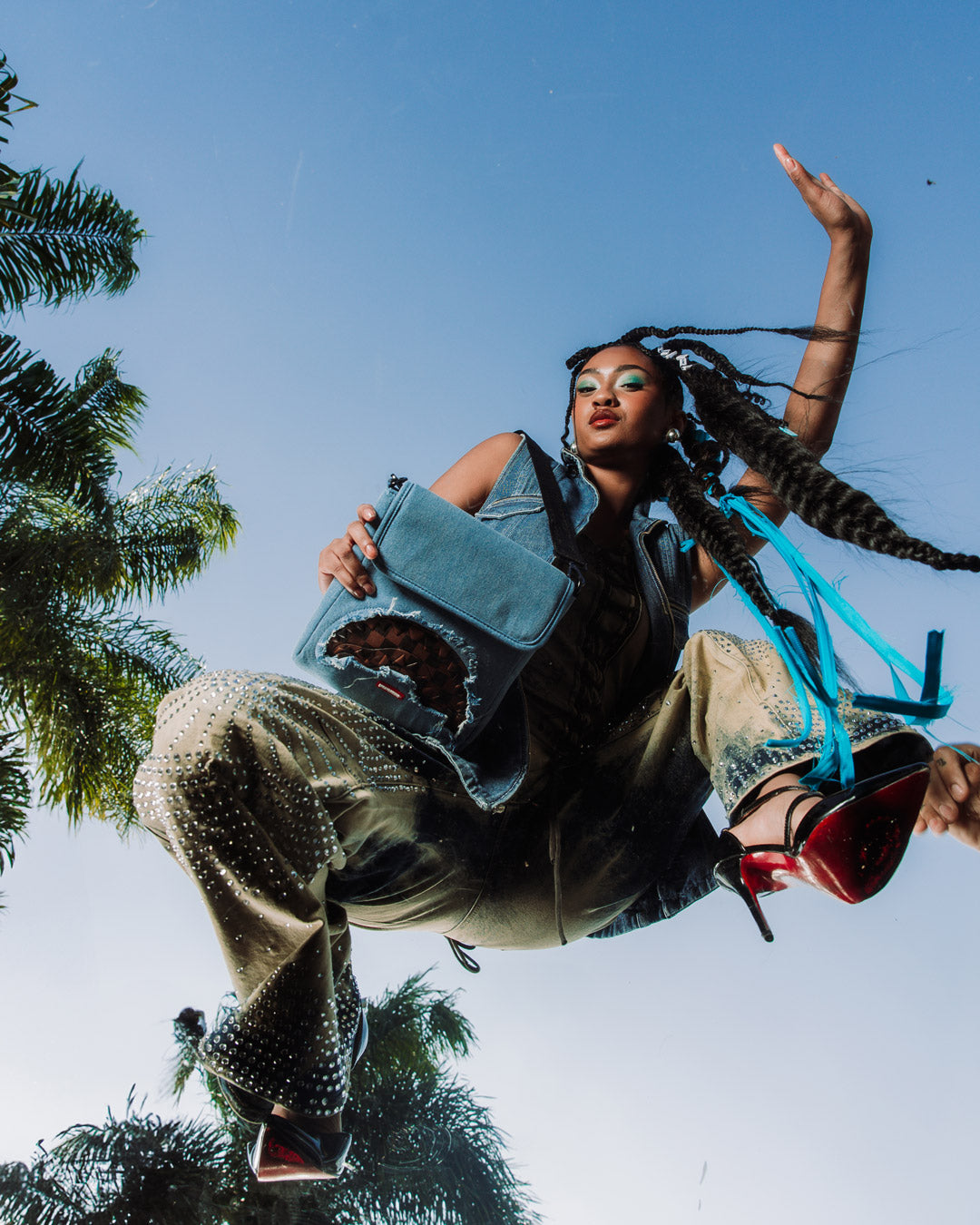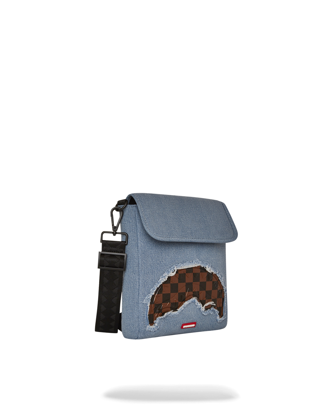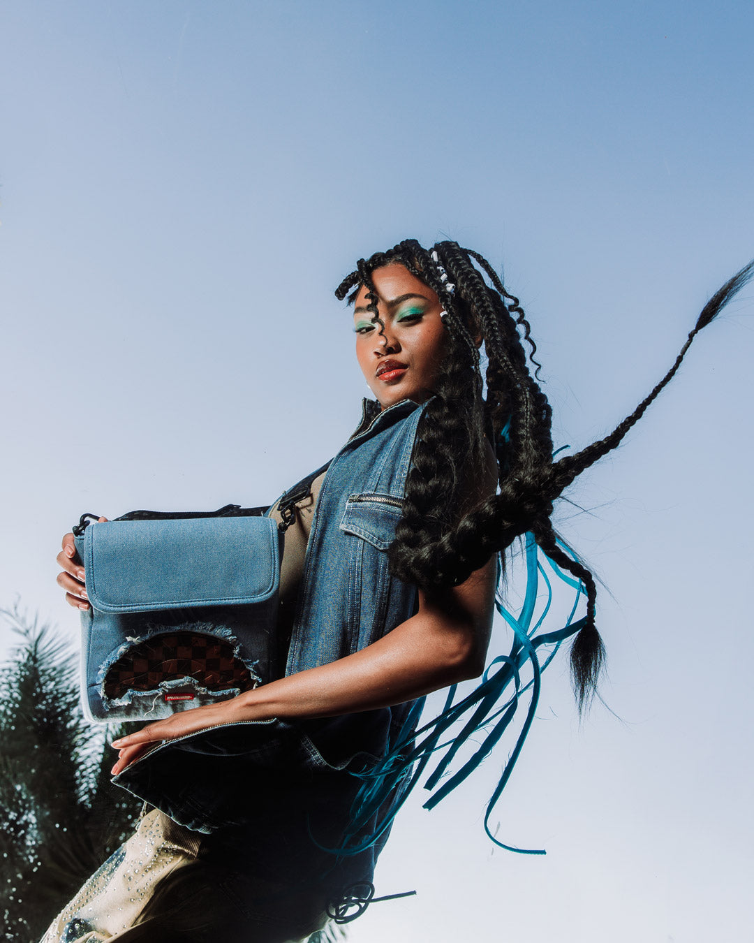 100% cotton denim bag with embossed details such as the sharkmouth and zipper pullers. Sewn faux leather details around the front zipper pocket. Adjustable strap.