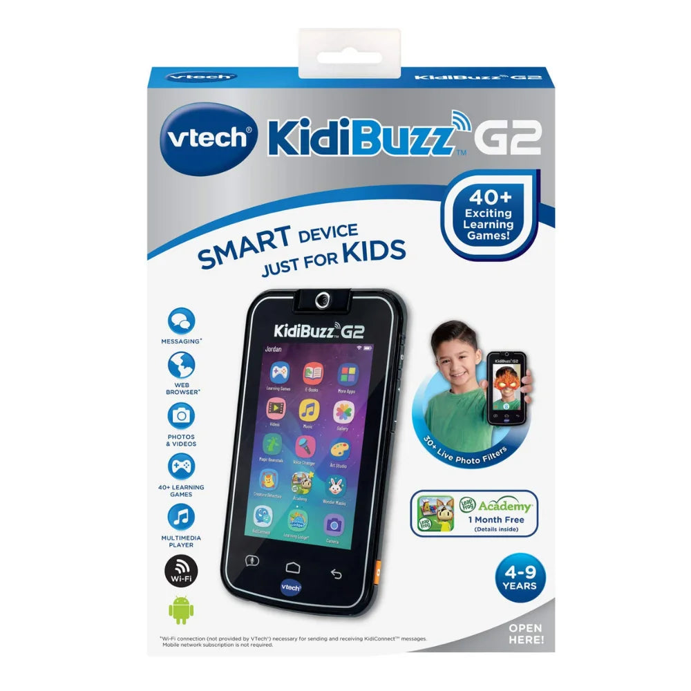 The VTech KidiBuzz G2 is a kid-friendly smart device designed to let children explore games, apps, photos, and messaging in a safe environment. With an easy-to-use interface, robust parental controls, and a durable design, it helps youngsters stay in touch with family members through text and voice messages (via Wi-Fi), while providing a fun way to play learning games, take photos, and record videos. The Black version offers a sleek look, making it suitable for kids who want a device that looks more grown-up while still offering the safety and security features parents demand.