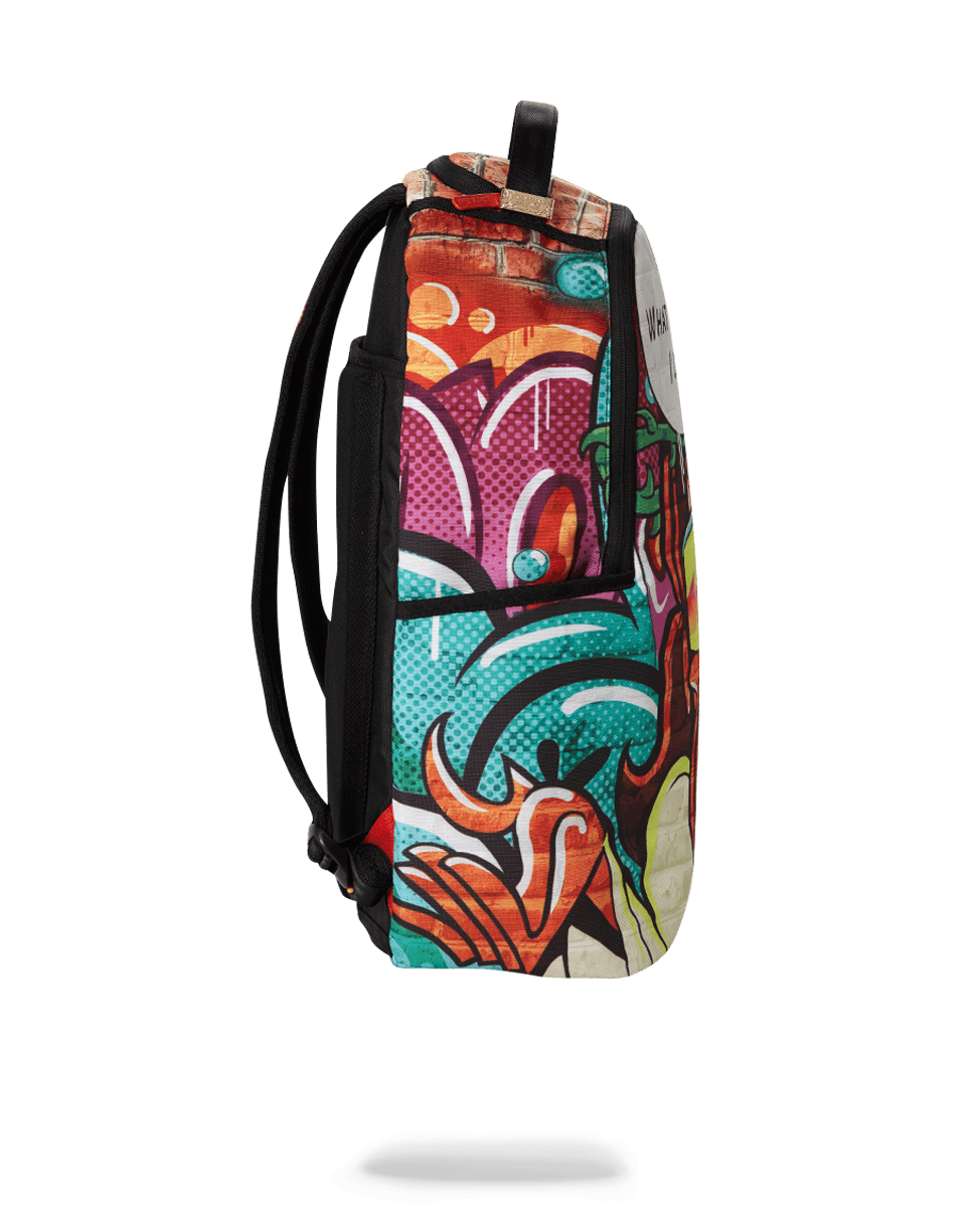 ExteriorDimensions: 18" x 6" x 11.5" ∙ Front zipper pocket ∙ Side pockets ∙ Zippered Stash pocket ∙ Ergonomic mesh back padding ∙ Adjustable Straps for custom sizing ∙ Nylon Zippers with Metal Hardware ∙ Metal "Sprayground Authentic" badge ∙ Slide through back sleeve connects to Carry on luggage to free your hands